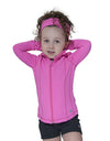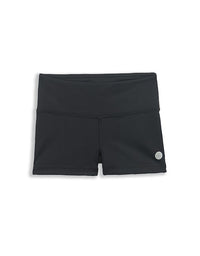 Girls 2-6 nylon/spandex jersey knit yoga shorts. Wide waistband and reflective logo print. Machine washable.